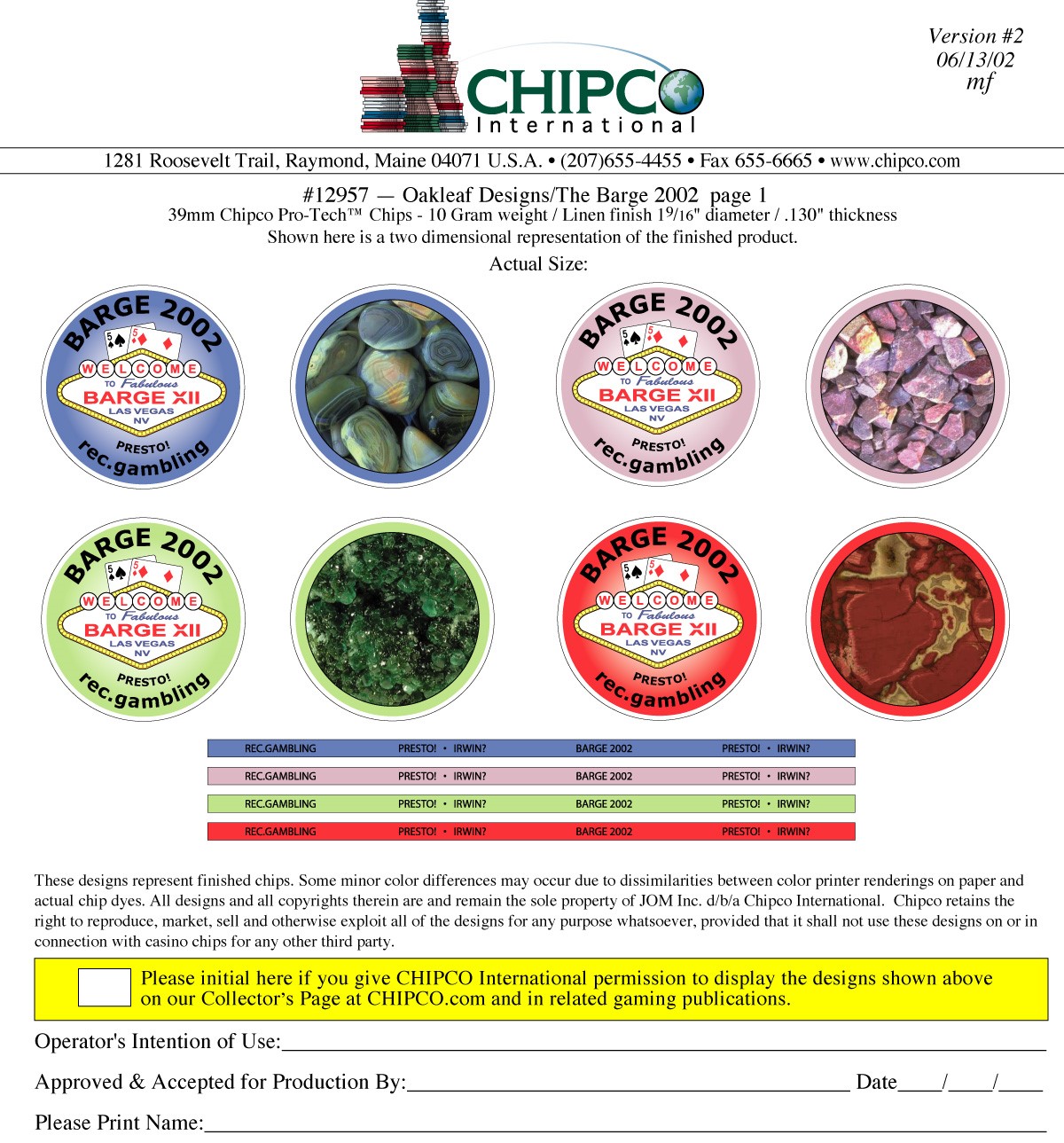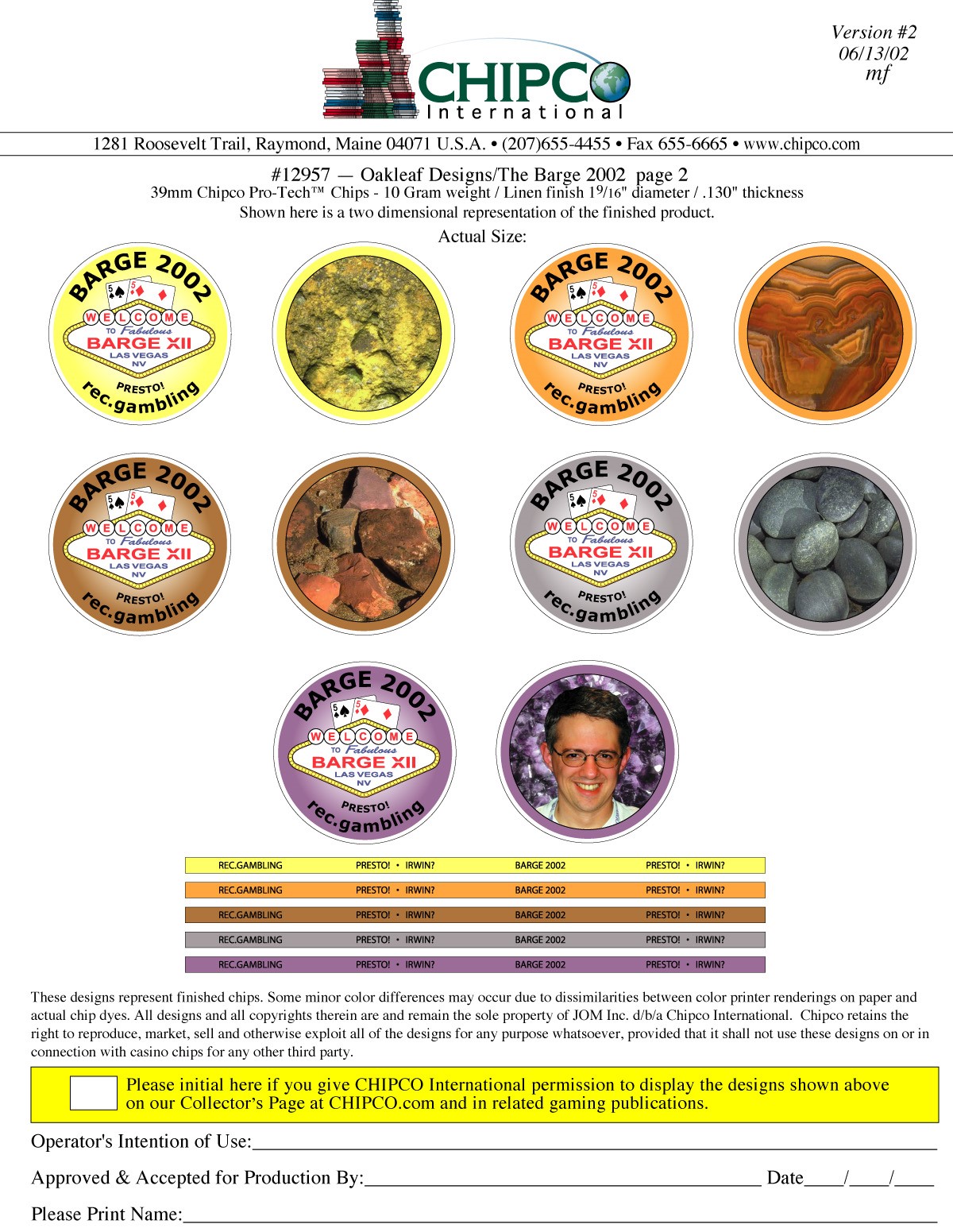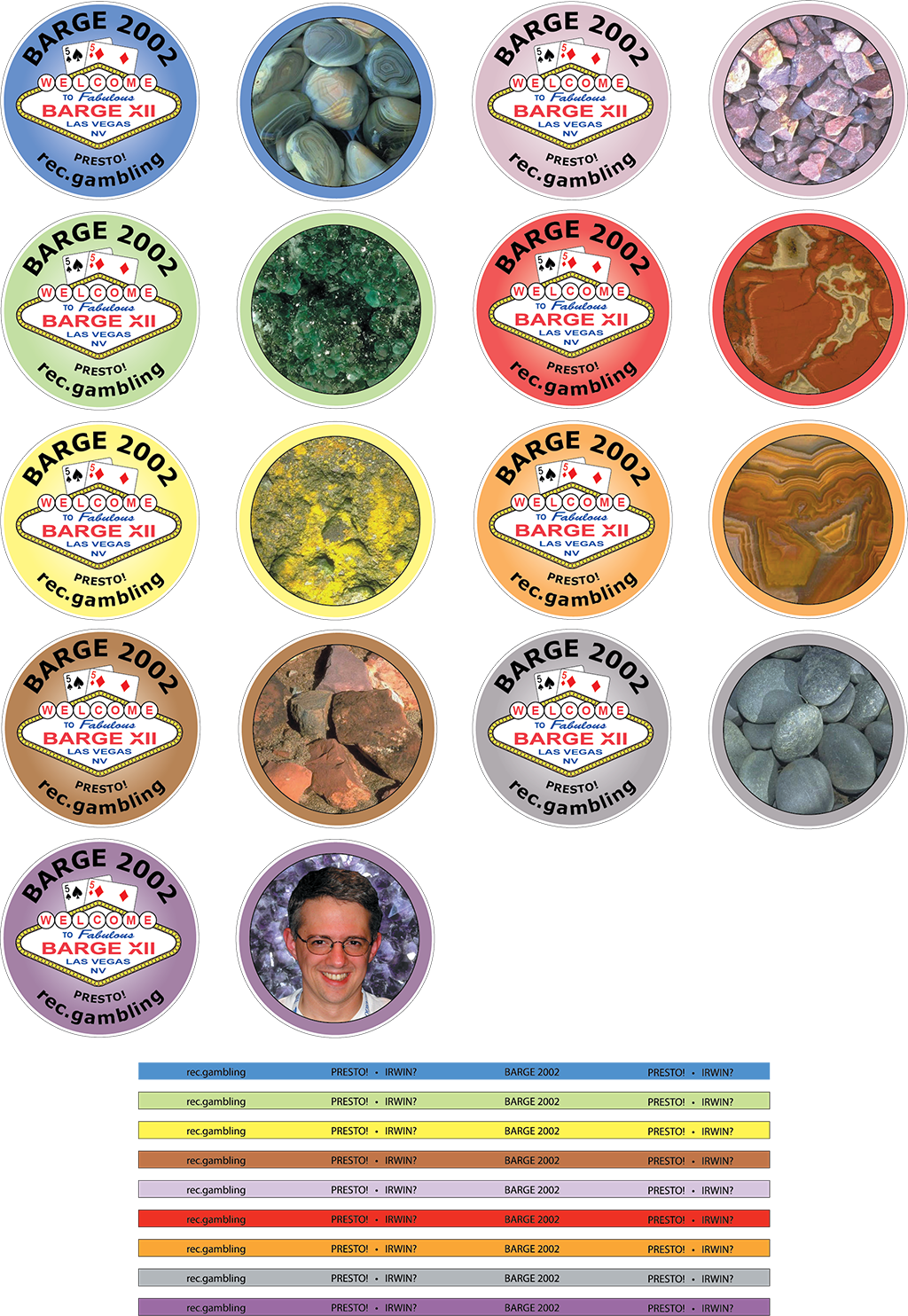 These chips were created by BARGE 2001 NLHE Champion Russell Fox, with the graphic design help of Patrick Milligan and the support and feedback of the BARGE Chip Committee. All chips in the Rocks set have a common obverse (the “Welcome to Fabulous BARGE” sign) with a different “rock” sample for each face. The colors used are the standard “Southern California” set.